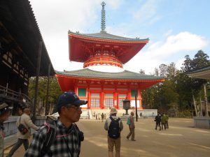 帰路の途中、全員で金剛峯寺、壇上伽藍への参拝、御影堂と金堂の間にそびえ立つ「三鈷の松」の見学をしました。葉先が三本の松葉を拾った人は、願い事が叶うそうです。大事にしましょう。