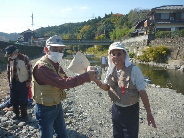 今回 の 優勝 は 中本さん の18 匹 で し た。 大物賞 は、 47cm を 釣り上 げ た 藤井 会長 でし た。