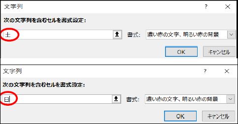 ●「ホーム」→「条件付き書式」→「セルの強調表示ルール」→「文字列」を選択し下図の入力を行う。