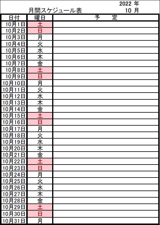 ●「条件付き書式」を使って曜日欄が、「土」または「日」の場合はピンクで塗りつぶしました。