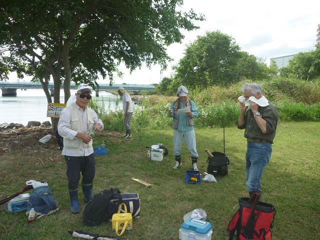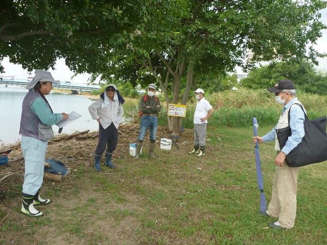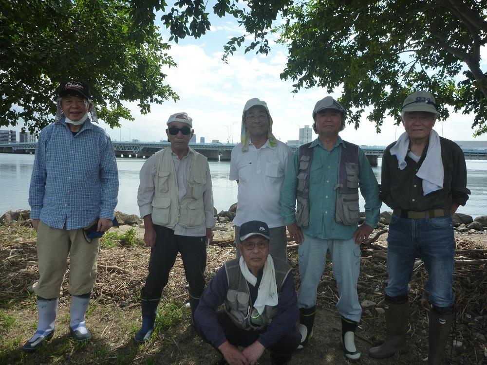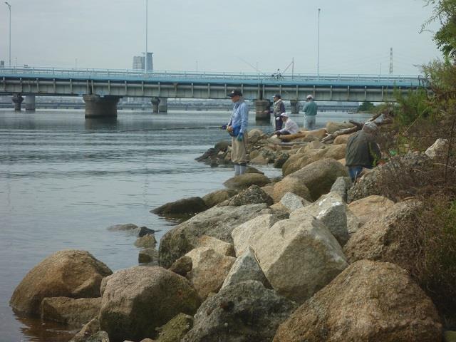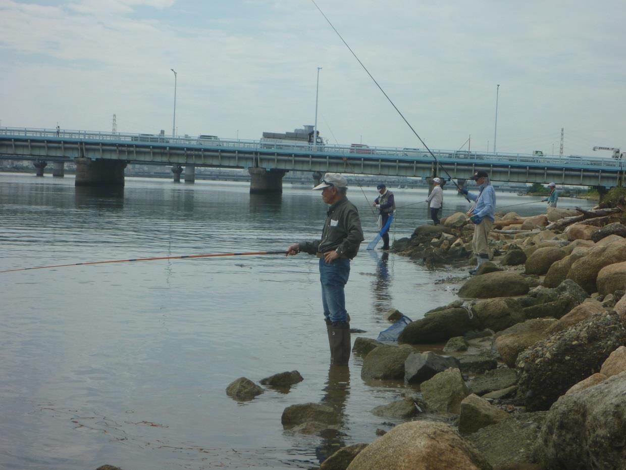 今年度、第4回の例会(ハゼ釣り)を実施しました。当日は、雨が心配でしたが、幸いにも曇り模様で、釣りには都合の良い天気となりました。場所は、阪神電車「姫島駅」から徒歩10分ほどの淀川河川敷で、参加者は7名でした。早朝8時半に現地に集合、会長さんの挨拶の後、今回の世話役である大西さんより、 ハゼ釣り大会の説明があり、入賞者には賞品がもらえます。ルールの説明の後、各自好みの場所を選び、釣り開始です。仕掛けは、ウキ釣り、投げ釣りなどで、餌は世話役さんに準備していただいた青イソメです。