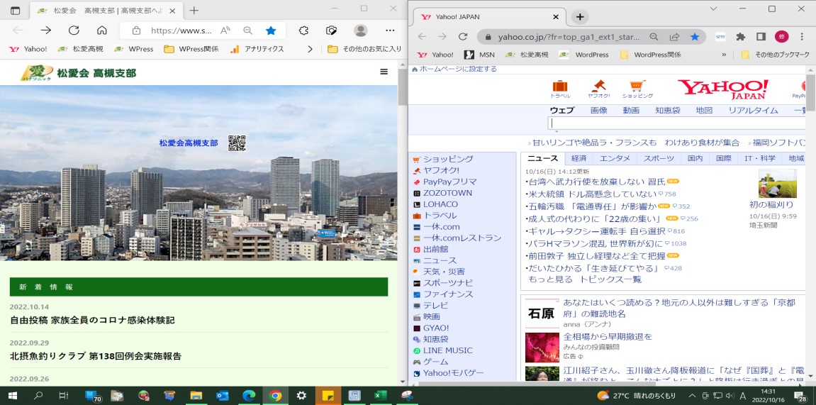 「Windows キー」+「右(又は左)の矢印キー」を押すと画面の半分の大きさに自動調整されます。