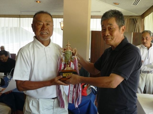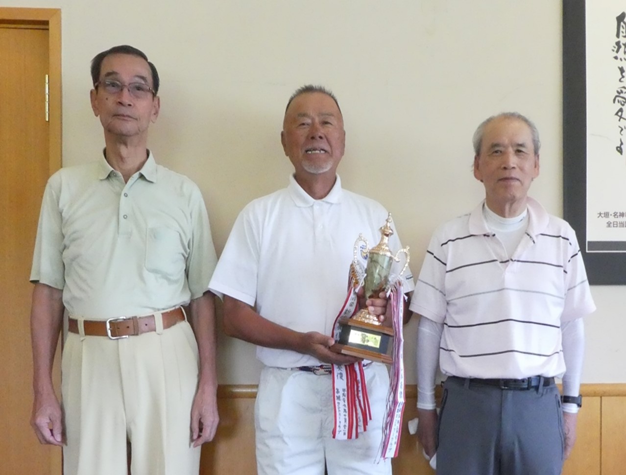 苦節10年、長きにわたり役員も務めてきたが、やっと念願の優勝ができた。今回、70歳を過ぎはじめてシニアティーからプレイさせて頂いた。おかげ様で今までパーが取れなかった長いミドルホール、そしてショート、ロングでもパーがとれたことが勝因です。メンバーにも恵まれました。今回はありがとうございました。