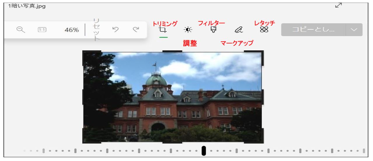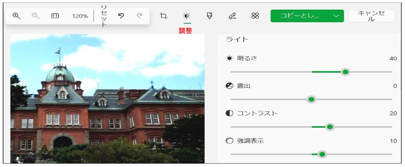 ② 明るさ等の修正方法:「調整」ボタンをクリックする。「明るさ」「コントラスト」等を修正する。
