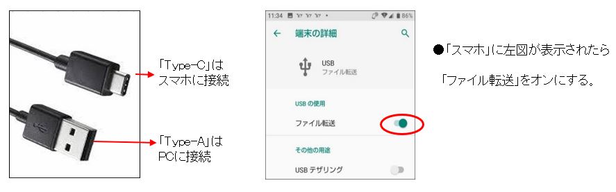 (1)ケーブルは「Type-C」 ↔ 「Type-A」 用を使用する。