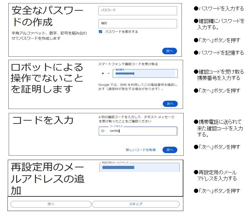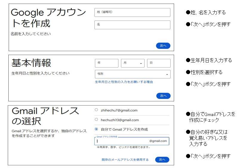(1)次のURLをクリックする: Google アカウントを作成 (エラー表示された場合は「次へ」ボタンを押す)