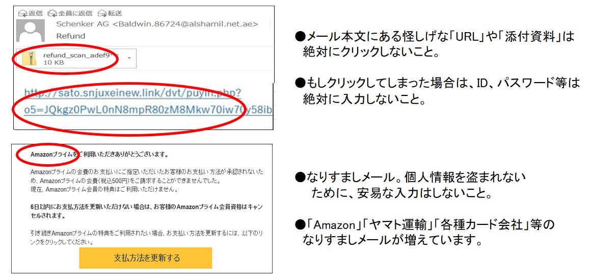 ・「Amazon」「ヤマト運輸」「各種カード会社」等のなりすましメールが増えています。