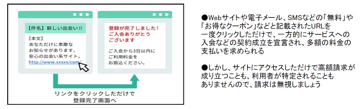 ネット閲覧中に「会員登録完了」等のメッセージを表示し、高額な料金請求をしてくる手口。
