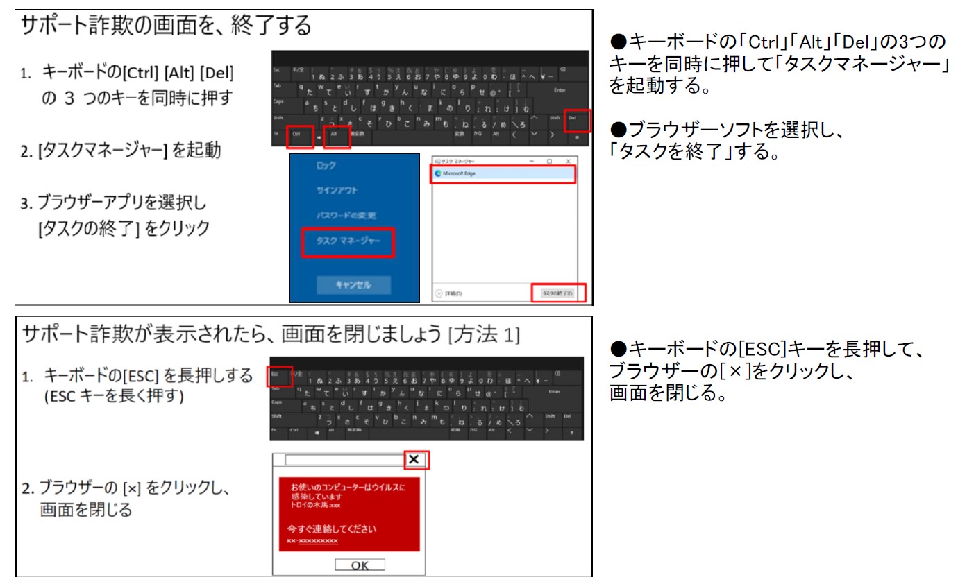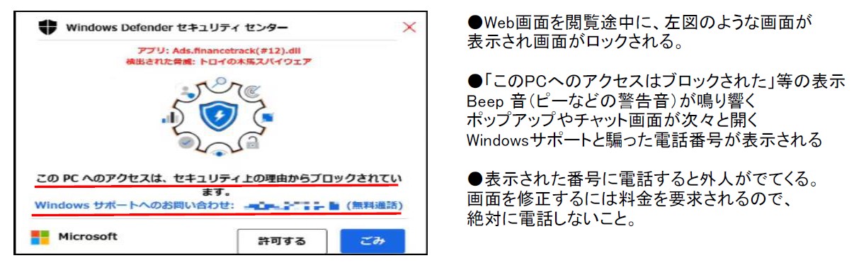 「ウイルスを発見」等を表示し、偽ソフトを購入させたり、ウイルス駆除費用を請求する手口。