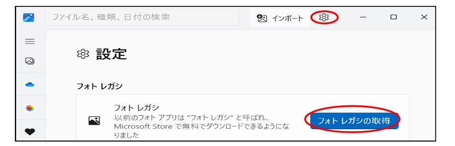 1.「フォト」を起動し「設定」から「フォトレガシ」を取得する。