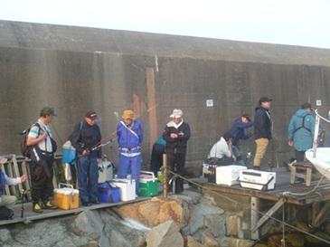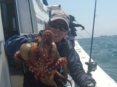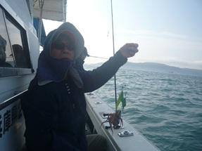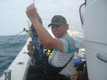 早朝5時に現地に集合し、くじ引きで釣り場所を決めて乗船、出航です。釣り場に到着後、竿、仕掛け等の準備を始め、タコ釣り大会の開始です。上位者には素敵な賞品がもらえます。タコ釣りは、エサは使わず、タコエギという疑似餌を使います。おもりをつけたエギを底まで落とし、おもりを底につけたまま、小さくしゃくり、タコを呼び寄せて、エギについた大きな針に引っ掛けて釣ります。今回は波が思った以上に高く、底からエギが離れないようにするのに、皆さん大変苦労されました。釣果も昨年(40匹)に比べ、低調に終わり、全員で9匹しか釣れませんでした。そんな低調な中でしたが、通常、なかなか釣れないキロオーバーの大ダコ(2.9kg)が釣れました。