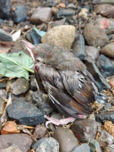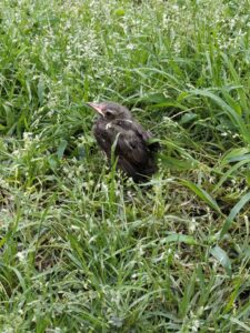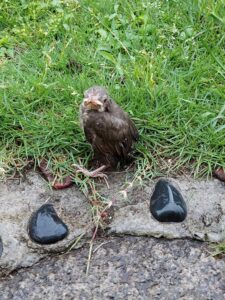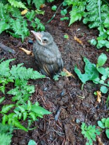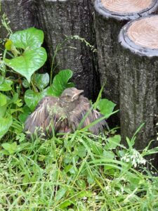 巣立つ日を今か今かと待ち受けていた6/14の早朝、いつもの様にスマホを近づけるや否やバタバタバタっと5羽が飛び立ってしまったかと思いきや、3羽が飛びきれず、我が家の庭に不時着~~巣から飛び出たわ良いが、未だ飛び立てない状態、、、