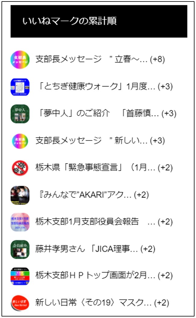 本年2月1日栃木支部HPトップ画面の変更を致しましたが、この度第2弾として投稿記事にいいねマークを付けるようにしました。このことにより記事に投稿者と購読者間の双方向のつながりを持つことが可能となりました。
