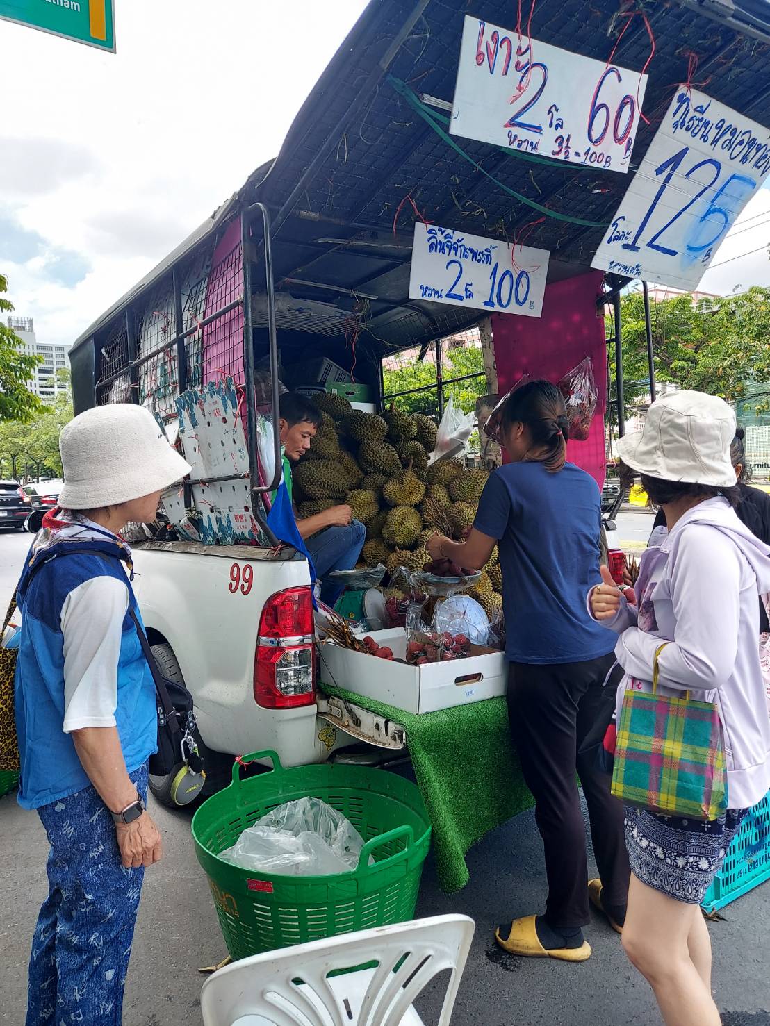 - ドリアンがびっしりと積まれた移動販売車 ライチが房で売られてます