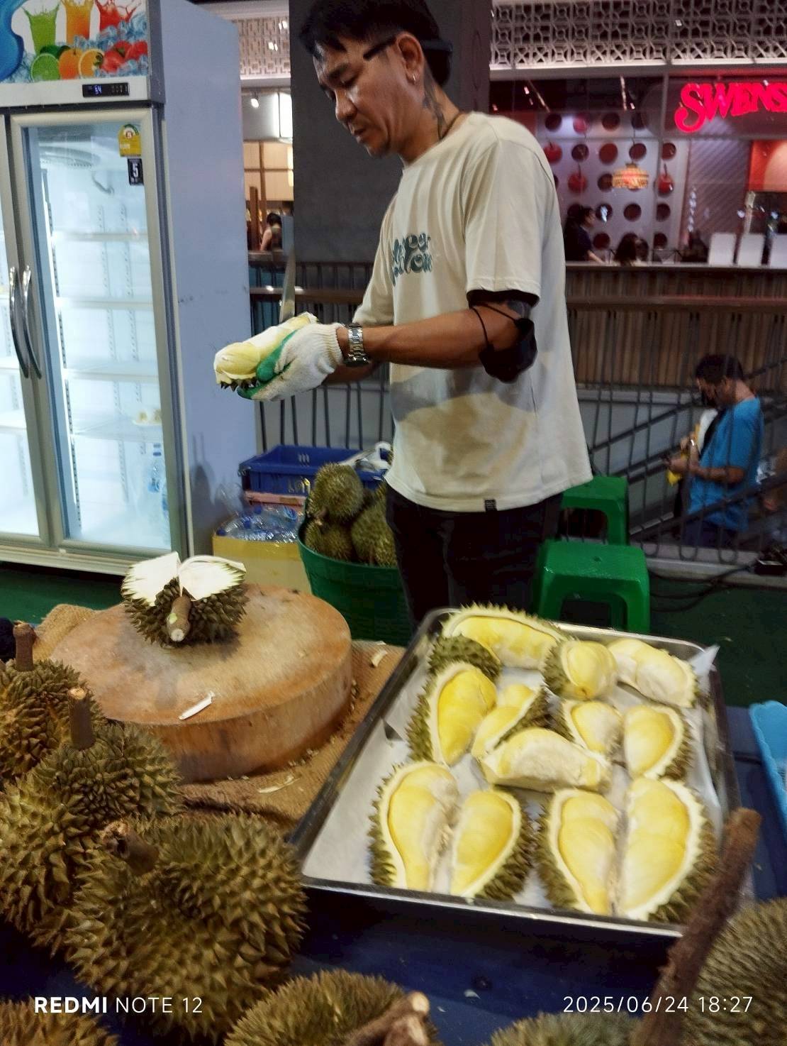 食べ物で何と言っても安くて美味しいのが【フルーツ】 毎日がフルーツ三昧、マンゴーは毎日一人個贅沢食べをしました。噂のフルーツの王様「ドリアン」にも挑戦!! 絶対食べたくないと思っていたドリアン、しかし 恐る恐る食べてみたら、な、 な、 何と とってもクリーミー、匂いも大して気にならず 好きになりました。日本でかぐ ドリアンの匂いは特別臭い気がします。