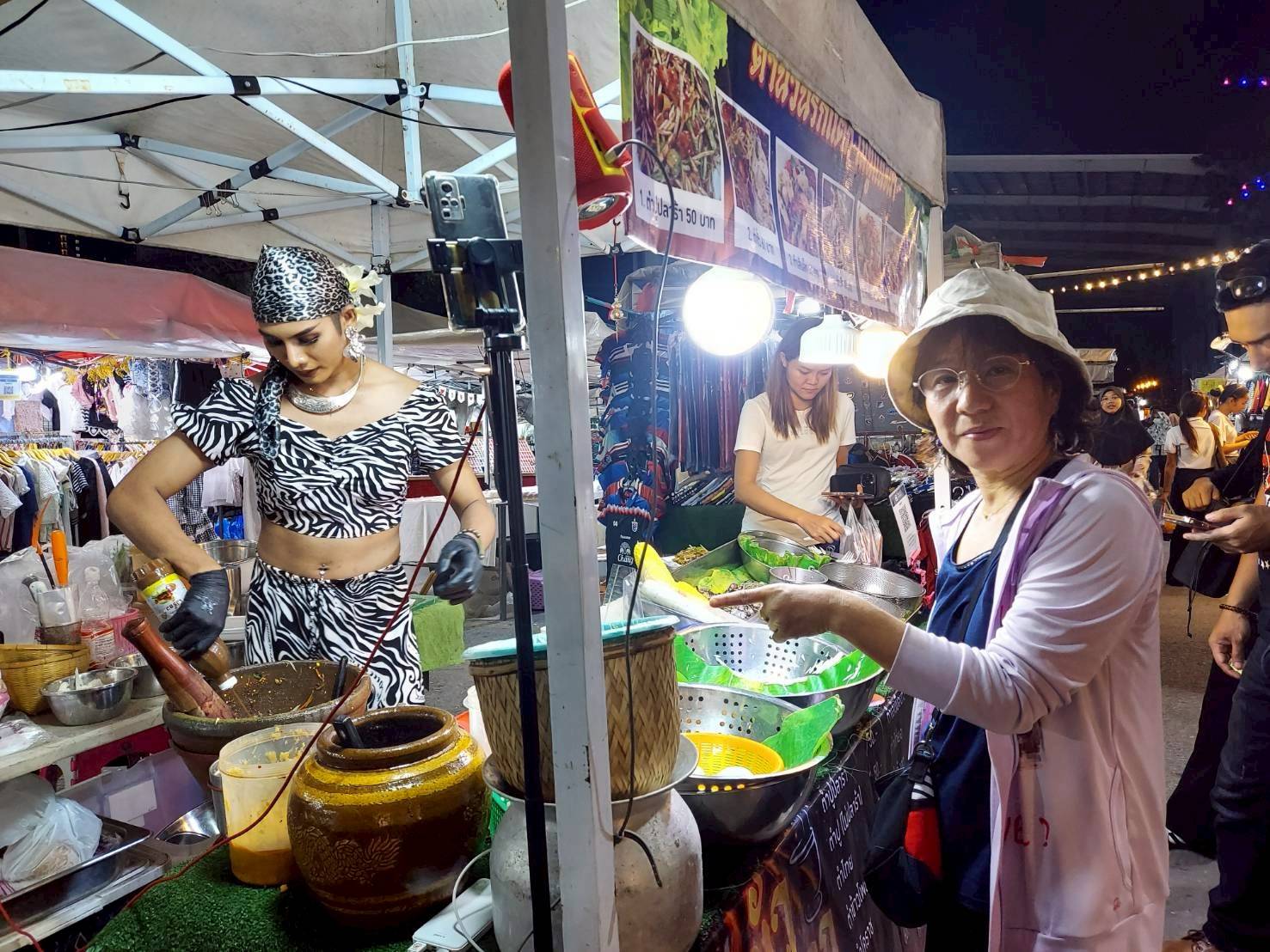 ナイトマーケットで一番人気のお店が お姉~の屋台のソムタム(パパイヤのサラダ)です。 ソムタムは専用かめを使い独自のスパイスの調合で作るお店によって随分と味が違います。