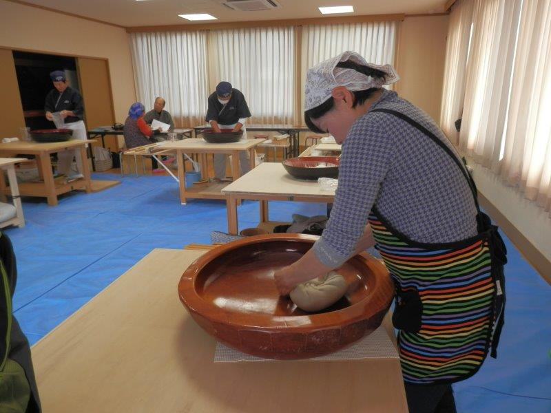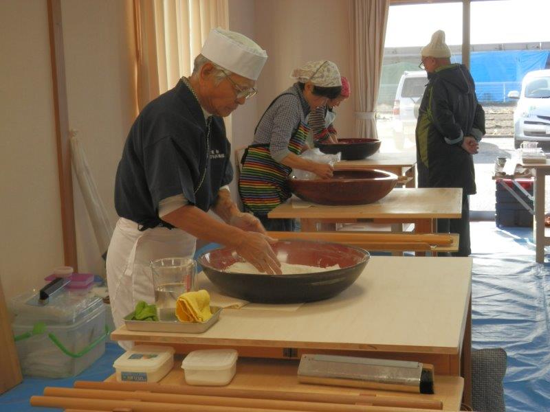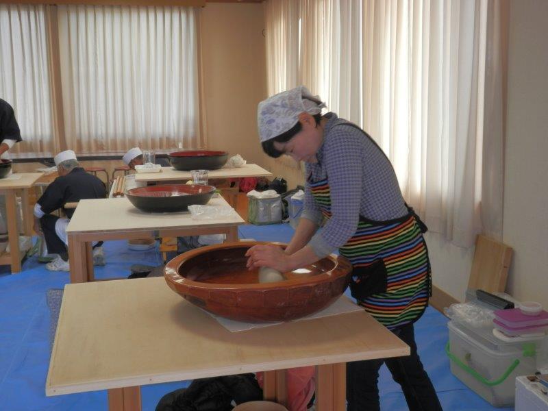 入会者1名、女性で全くの初心者。そば打ちに対する意欲は旺盛だ。厳しくても楽しい「そば打ちの旅」の始まり。みんなで優しく見守ってやりましょう。
