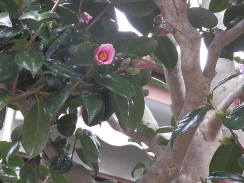 侘助の花が咲き始めた。春はまだ先だよという、申し訳なさそうな花の咲きようだ。