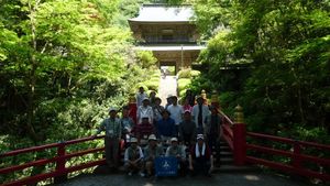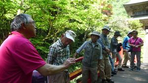 今回の歩こう会はまず、大田原観光協会でボランティアガイドさんと落ち合って恒例のラジオ体操後、芭蕉が14日間も滞在したという黒羽へ。臨済宗妙心寺派の禅寺 古刹雲巌寺(開山 1283年)ではモミジや杉の巨木に覆われて暑さもまったく気にならず武茂川にかかる爪瓞橋(カテツキョウ)で山門をバックに集合写真。