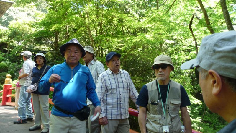 今回の歩こう会はまず、大田原観光協会でボランティアガイドさんと落ち合って恒例のラジオ体操後、芭蕉が14日間も滞在したという黒羽へ。臨済宗妙心寺派の禅寺 古刹雲巌寺(開山 1283年)ではモミジや杉の巨木に覆われて暑さもまったく気にならず武茂川にかかる爪瓞橋(カテツキョウ)で山門をバックに集合写真。