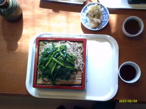 2月4日 鹿沼の名産のニラそばを食べたくなった。我が家の恒例行事の一つである。2月になると鹿沼で栽培されるニラがとても美味い季節になる。甘みがありそばにのせて食べるのが楽しみになっている。そういう理由で鹿沼のニラそばなのである。宮入そば店に11時40分位を目安に自宅を出発。途中、妻の姉をPICUPして3人で目的地を目指す。到着は予定通り11時40分であった。早速お店に入り座敷席に座るとすぐさま注文する。私はニラそばを注文するが皆も同じで3人分となった。薬味やそばつゆが出され続いて待ちに待ったニラそばの登場だ。最初にニラだけを食味する。甘みがあり食感もしゃきしゃきして美味い!続いてそばを食す。細切りで腰がしっかりしたそばである。これも何も付けずそばの味を楽しむ。次にそばつゆと薬味のネギわさびを多めに取りそばつゆに混ぜる。盛りそばだが、量も多く満足のいく量である。他のお客さんは大盛りを注文する人が多いように見受けられる。メニューは色々あるが、ほとんどのお客さんはニラそばを注文している。駐車場の車は他県ナンバーが目立つ。知る人ぞ知るお店なのである。食べ終わると3人顔を合わせて”美味かったね。