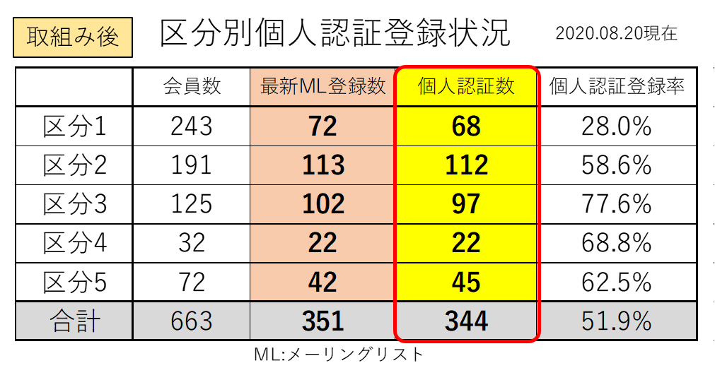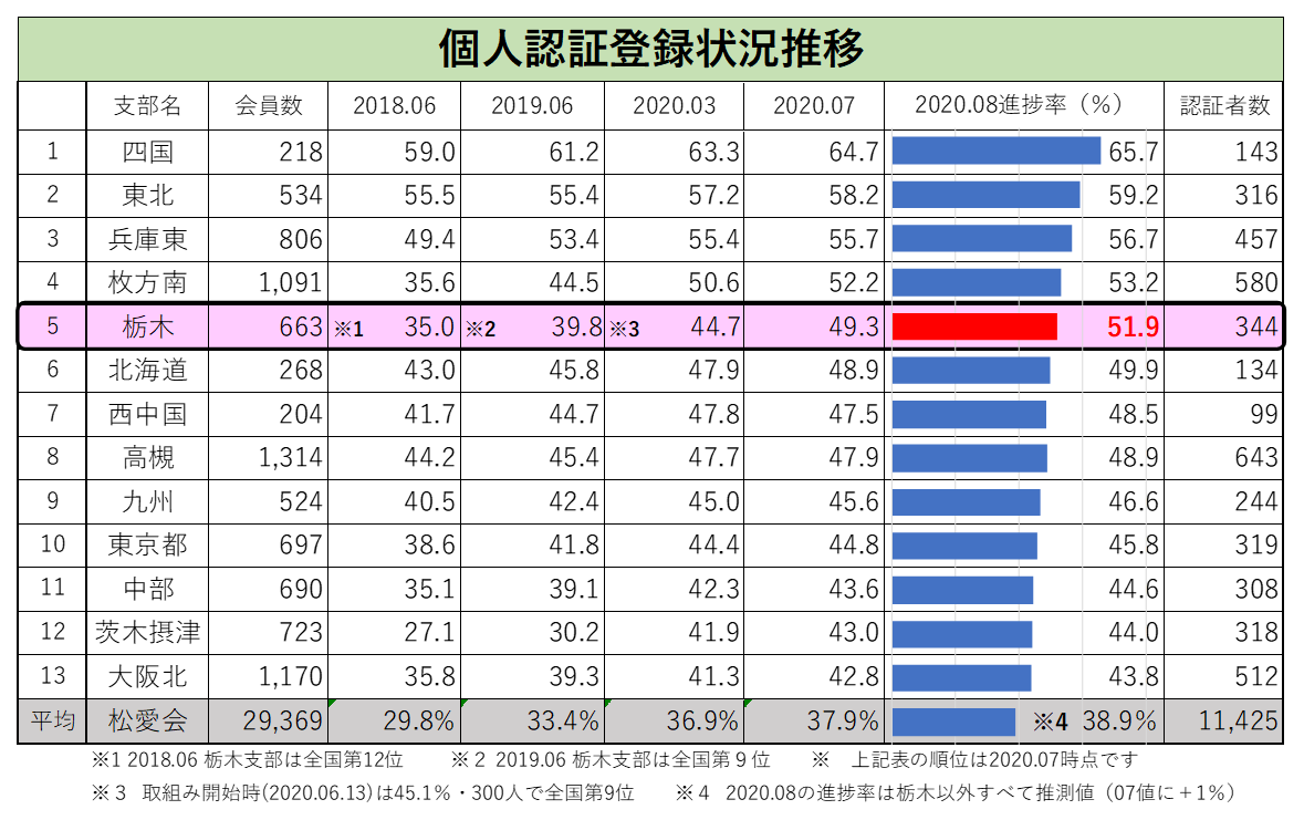 栃木支部としてホームページにおける個人認証登録率の向上を目指し2020年6月13日より2ヶ月間にわたり各区分ごとに取り組んでまいりました。結果お蔭様でスタート時45.1%であった登録率が+6.8%(44名)アップし、51.9%となり50%を超えることが出来ましたので報告させて頂きます。