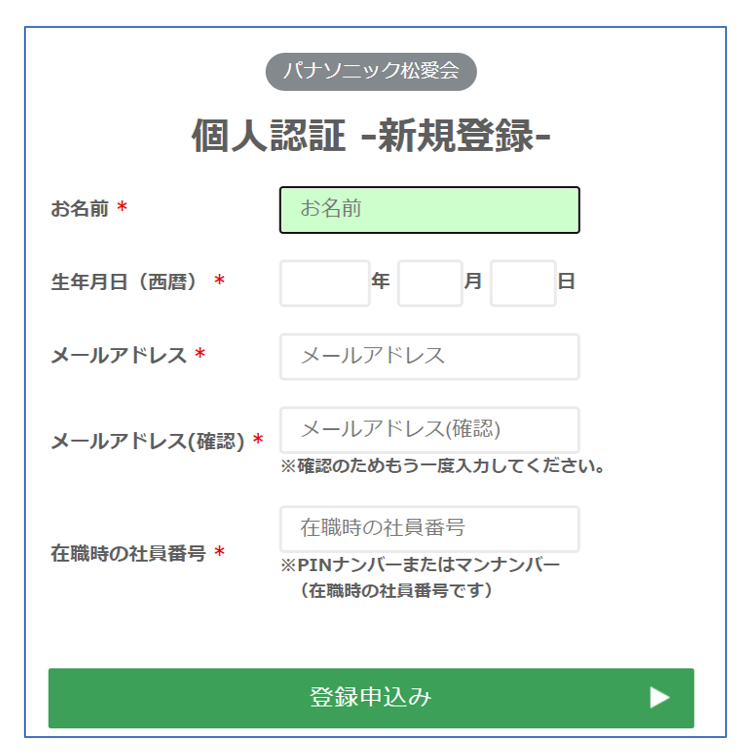 ➂個人認証-新規登録- 画面が出るので「名前」「生年月日(西暦8桁」「メールアドレス」「在職時の社員番号」を