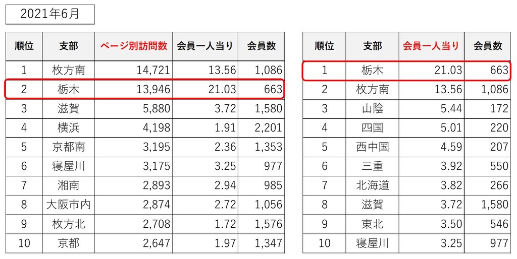 支部別HPアクセス数の評価基準が全てのページを訪問した数「全ページのページ別訪問数」を「会員一人当り」で見た「会員一人当りのページ別訪問数」で評価することになりましたが、2021年6月度は「会員一人当り」が21.03でした。これで2020年4月から2021年6月まで連続15ヶ月全国1位となりました。この記録はひとえに多くの会員の皆様が支部HPにアクセスして頂けた結果であります。ここに改めて御礼申し上げます。