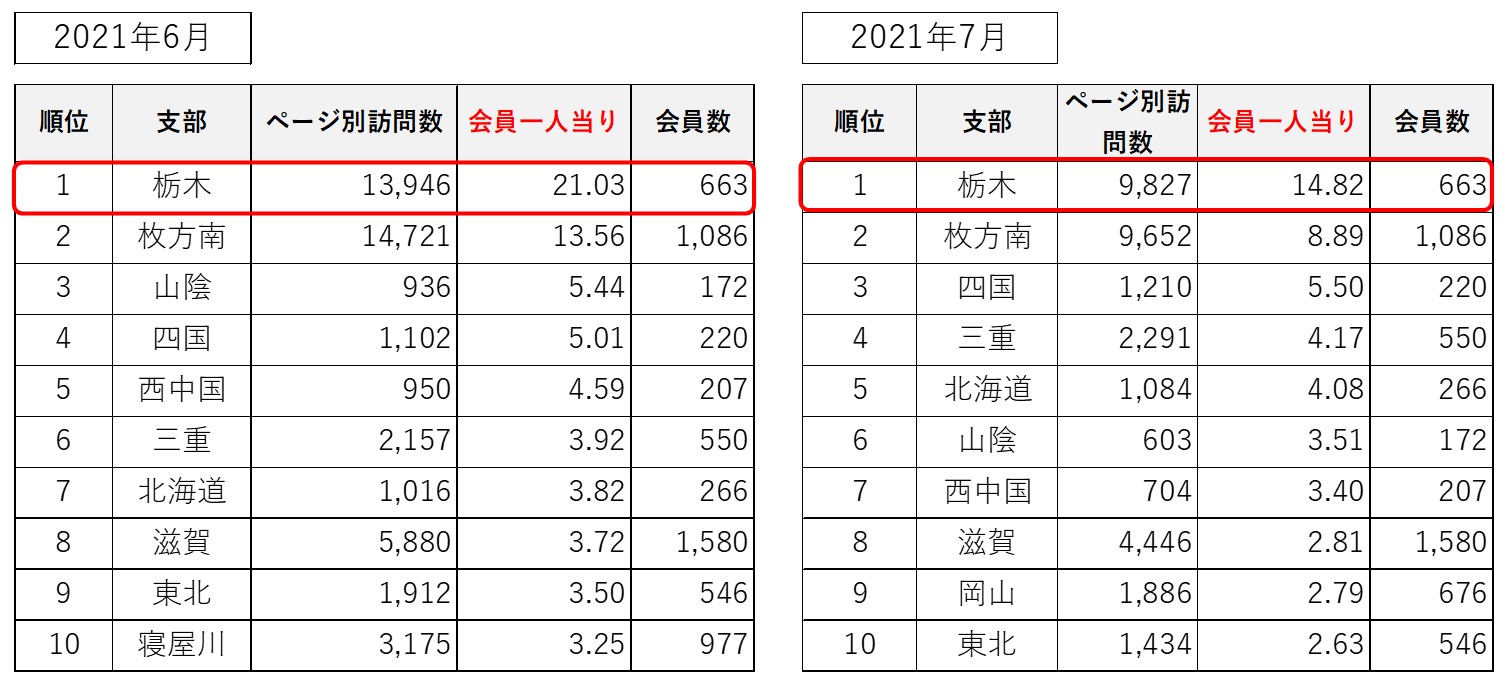 支部別HPアクセス数の評価基準が全てのページを訪問した数「全ページのページ別訪問数」を「会員一人当り」で見た「会員一人当りのページ別訪問数」で評価することになりましたが、2021年7月度は「会員一人当り」が14.82でした。この数字(約15)は栃木支部の会員が2日に1回はHPの記事を閲覧したと言う事になります。支部数値目標は「30」で「会員が1日1回は閲覧する」を目指しております。引き続き旬な情報をタイムリーに提供させて頂きますのでご支援の程宜しくお願い致します。