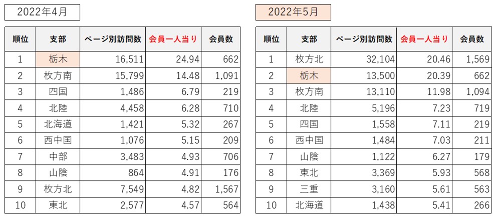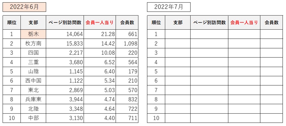 支部別HPアクセス数の評価基準が全てのページを訪問した数「全ページのページ別訪問数」を「会員一人当り」で見た「会員一人当りのページ別訪問数」で評価することになりましたが、2022年6月度は「会員一人当り」が21.28でした。先月(20.39)より0.84ポイント増加しました。支部数値目標は「30」で「会員が1日1回は閲覧する」を目指しております。尚、次月度からは報告フォームを変更した形で掲載したいと考えております。引き続き旬な情報をタイムリーに提供させて頂きますのでご支援の程宜しくお願い致します。