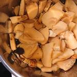 一方、お母ちゃんはセリの水洗いから戻り、早速、天ぷらだ。コシアブラ、セリ、タラの芽の3種類だ。水洗いしているため油がはねるのでペーパーで水分を切りビニール袋に入れ、小麦粉を入れてよく振る。これで天ぷら粉をつけあげる。次に、タケノコの調理を始める。具材は椎茸、ちくわ、タケノコだけのシンプル煮物。調味料は、だしの素、砂糖、酒、醤油、みりんで煮込む。(写真⑦、⑧)