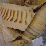 ②タケノコを掘る。 田んぼのあぜ道を探す。すぐに5本ほど見つけた。早速持ってきたスコップで掘る。タケノコの先端の葉っぱの向きを確かめスコップを根元に3回ほど差し込み左手で揺さぶると簡単に採れる。合計10本ほど採った。重たいので道ばたにタケノコを寄せて次の場所に移動。(写真②)