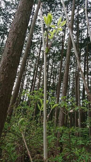 ④コシアブラの芽を摘む。 さらに山に入り(この辺の標高は230mである)コシアブラの木を探す。有った!有った!お母ちゃんの声が弾む。(写真③)2人で夢中になりコシアブラを摘んだ。握り拳大の大きさで6つほど。十分な収穫である。時計を見ると12時を過ぎていた。