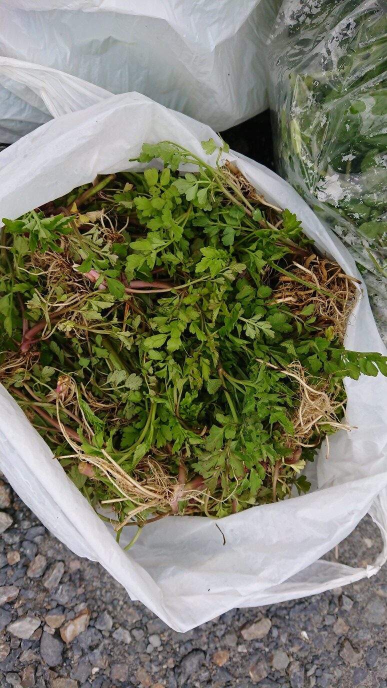 最後に、火の始末である。10Lのバケツで4杯大谷石の周囲に掛ける。後は、燃え残った燃料を取り出し水を十分に掛け火の始末をして完了。自宅に戻ったのは3時過ぎ。早速、セリの水洗い。根っこの部分の土を洗い落とす。