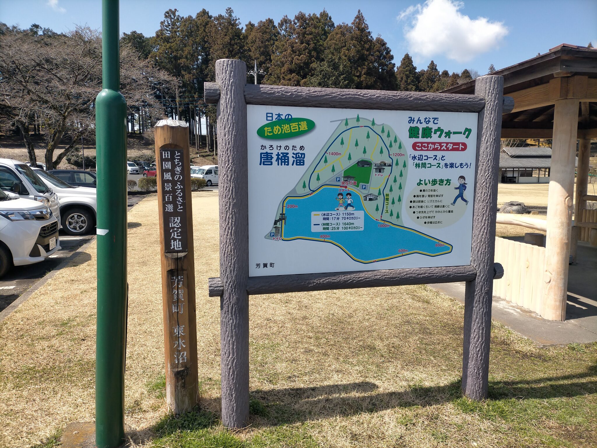 貯水槽の農道を通って唐桶宗山公園(唐桶の溜)へ到着。一休みをして溜池の周りは健康ウオークコース(1周1150m 17分)です。体調がよければ2周回って自宅へ戻ります。