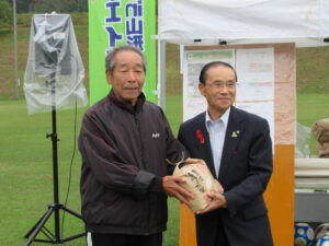 二日目は予報が当たり雨模様で東北の雨は冷たく感じられ動きが悪く優勝に一歩届かず両チームとも準優勝で昨年より良い成績を収め新米60キロの精米小分け袋で頂きました。当日、家へのお土産を持ち帰ることが出来ました。試合中「70過ぎてこんな雨の中でサッカーできる健康に感謝しないとな」との声もあり感謝、感謝の大会でした。