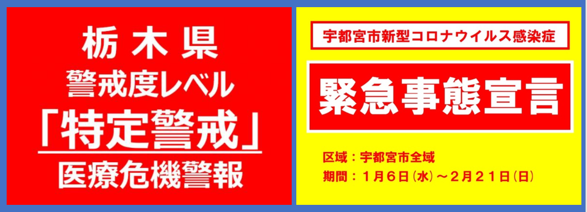 コロナウイルス感染状況ですが、栃木県の緊急事態宣言は2月7日で解除されましたが、引き続き2月21日まで「特定警戒」と「医療危機警報」が出されており、宇都宮市は独自に2月21日まで「緊急事態宣言」を発出しております。