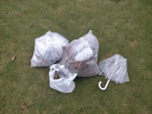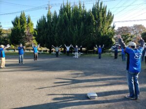 最初に健康体操を行い、北垣支部長の挨拶後に、参加者にゴミ袋と火ばさみを渡して公園内の清掃を行いました。公園の駐車場にはたばこの吸い殻が多く捨てられてマナーの悪い人がいるのが残念です。また、公園の入口通路の落ち葉を集め清掃しました。集めたゴミは45Lのゴミ袋二袋が一杯になりました。 皆さんお疲れ様でした。