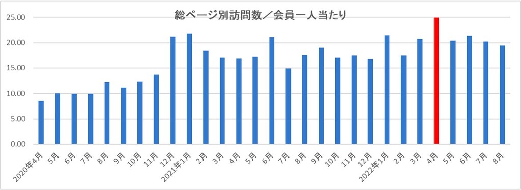 支部HPアクセス数の評価基準が全てのページを訪問した数「全ページのページ別訪問数」を「会員一人当り」で見た「会員一人当りのページ別訪問数」で評価することになりましたが、2022年8月度は「会員一人当り」が19.5でした。先月(20.3)より0.8ポイント減少しました。栃木支部の数値目標は「30」で「会員が1日1回は閲覧する」を目指しております。尚、先月(8月)からは報告フォームを変更した形で掲載しております。引き続き旬な情報をタイムリーに提供させて頂きますのでご支援の程、宜しくお願い致します。