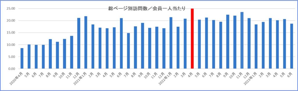 支部HPアクセス数の評価基準が全てのページを訪問した数「全ページのページ別訪問数」を「会員一人当り」で見た「会員一人当りのページ別訪問数」で評価することになりましたが、2023年6月度は「会員一人当り」が18.7でした。先月(20.6)より1.9ポイント減少しました。6月のHP更新数は30回と毎日更新できましたが、5月比一日当たりのアクセス数は10%ほど悪化しておりその分減少したものと考えられます。
