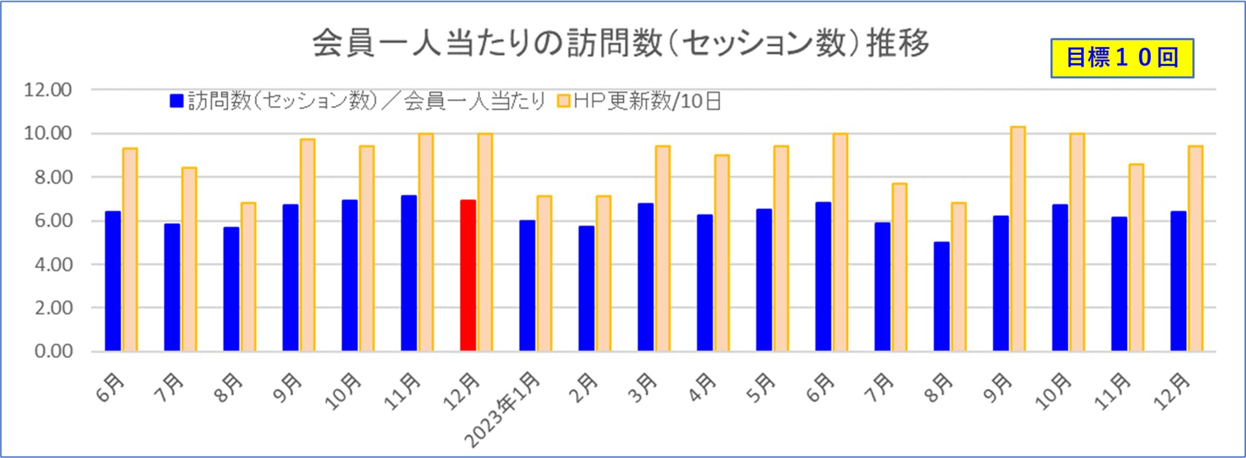 さて、12月度の「会員一人当りのHP訪問数(セッション数)」の実績は「6.4回」ですので12月度は全会員が約6.4回ホームページを訪れたことになります。先月は「6.1回」でしたので0.3回増加しました。要因は投稿記事が先月より若干多く、HPの更新回数が29回と増えたことにあります。引き続き旬な情報をタイムリーに提供させて頂きますのでご支援の程、宜しくお願い致します。