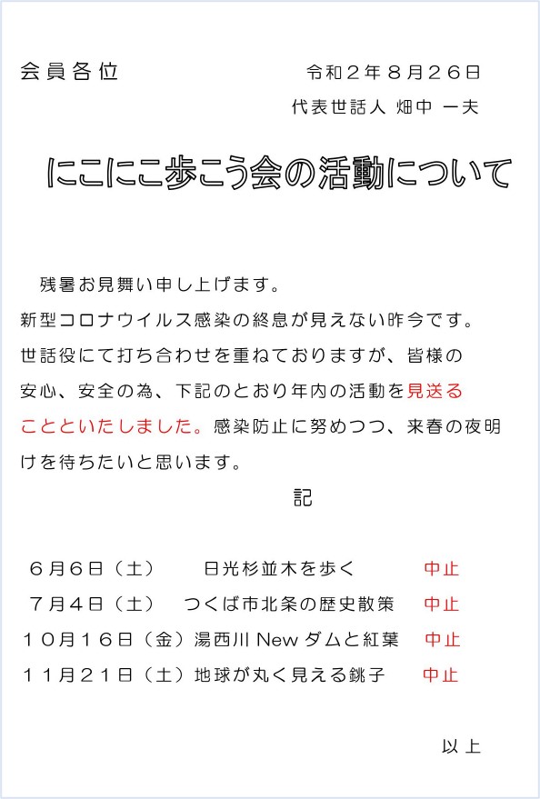 にこにこ歩こう会会員の皆様、春以来のコロナ禍、そして連日の猛暑の中いかがお過ごしでしょうか? 緊急事態宣言による外出自粛と夏の熱中症予防で運動不足気味かと思いますが健康に留意され頑張っておられると思います。