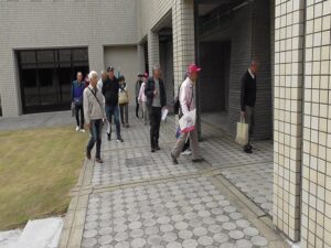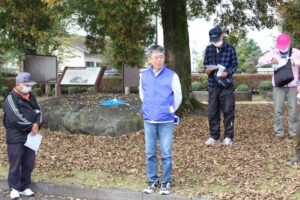 壬生城址公園駐車場に8:45分集合でしたが、壬生城址公園の住所が壬生駅になっていたため皆さん迷いながら壬生城址公園駐車場へ到着されていました。(担当橋本のミスです。申し訳ございません。) 当日は晴天で見学日和となりました。前役員の植月さんの指導で健康体操を茨城弁バージョンで行った後、北垣支部長の挨拶で始まり、配付した資料の確認と本日の歴史散策コースを案内いただく壬生町観光協会から派遣いただいた、壬力の町(魅力の当て字)ガイドボランティアの会の副会長高山重隆さん、福田ひろ子さんは、手塚基二さん、大山宏さんを紹介して2班に別れて見学コースを散策しました。