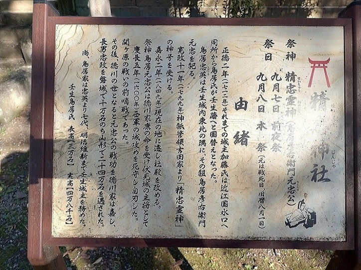 精忠神社は鳥居家壬生藩の祖鳥居元忠を「精忠霊神」として祀る。元忠の血染めの畳を埋めた塚がある。現在、大河ドラマに毎回登場中であり、参加者の関心を集めました。