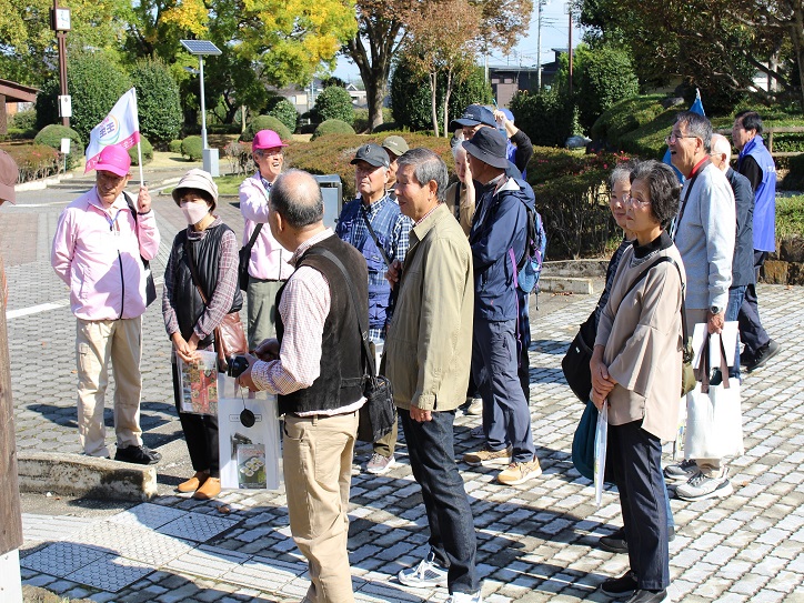 壬生城址公園駐車場に8:45分集合でしたが、壬生城址公園の住所が壬生駅になっていたため皆さん迷いながら壬生城址公園駐車場へ到着されていました。(担当橋本のミスです。申し訳ございません。) 当日は晴天で見学日和となりました。前役員の植月さんの指導で健康体操を茨城弁バージョンで行った後、北垣支部長の挨拶で始まり、配付した資料の確認と本日の歴史散策コースを案内いただく壬生町観光協会から派遣いただいた、壬力の町(魅力の当て字)ガイドボランティアの会の副会長高山重隆さん、福田ひろ子さんは、手塚基二さん、大山宏さんを紹介して2班に別れて見学コースを散策しました。