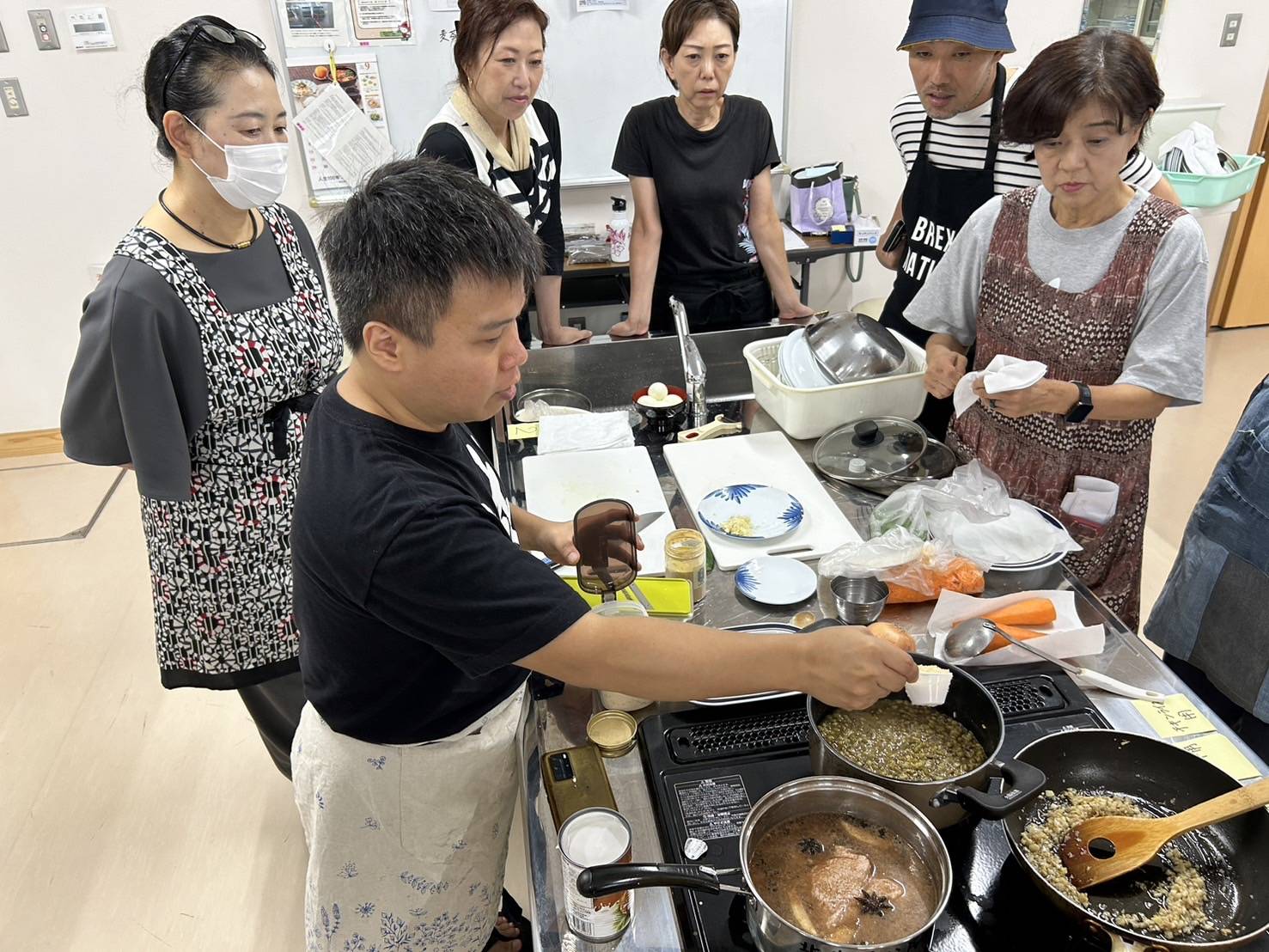 今回の参加者の中で男性が3人おりました。料理男子の方は自ら率先して調理しておりました。先生の指導を熱心に動画を取っている姿が印象的でした。作るより、食べる事を楽しみにきた男性参加者もおりました。