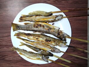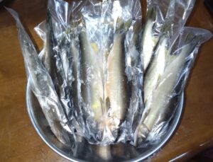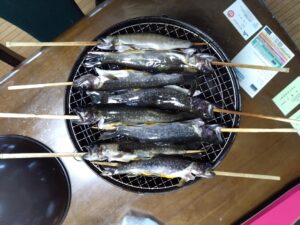 我が家は私に合わせてくれているのか、みな魚が大好きです。下の上段の写真は釣ったイワナを焼くところですが、2枚目のマルチミニバーベキューコンロを使いました。このコンロでは①焼ける魚の数が制限される ➁網に魚の皮がくっついてしまうなどの欠点がありました。