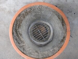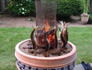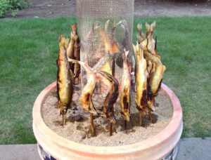 そこで、植木鉢の砂を全部戻して中に入っている空き缶と小さな植木鉢の組み合わせを変えて高さ調整をしました。それが下の左側、真ん中の写真となります。冷凍鮎がありましたので再度焼いてみました。今度はうまくできました。
