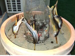 下図、左側は炭篭の全景です。この炭篭は焼き終わったのち、一番右側の炭消壺に容易に入れられる構造となっておりますので鮎を焼いた炭火の後始末が非常に簡単でした。ただ、今回の一番の失敗は鮎焼き器の重さです、総重量約50㎏となり簡単に移動できません。次は軽いものを考えていきます。
