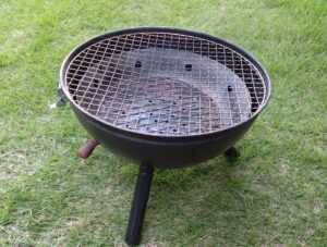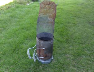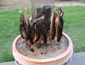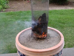 準備はできました。家にあった廃材の鉄製網ととりかごの底の部分をグラインダーでカットし下図左側の写真のような形の炭を入れるかごを作りました。大きな植木鉢も中に入れた小さな植木鉢も底をカットした空き缶も空気の通り良い様に組み合わせをしました。早速、右の写真のように鮎の試し焼きをしましたが、鮎と炭火の高さがうまく合いませんでした。